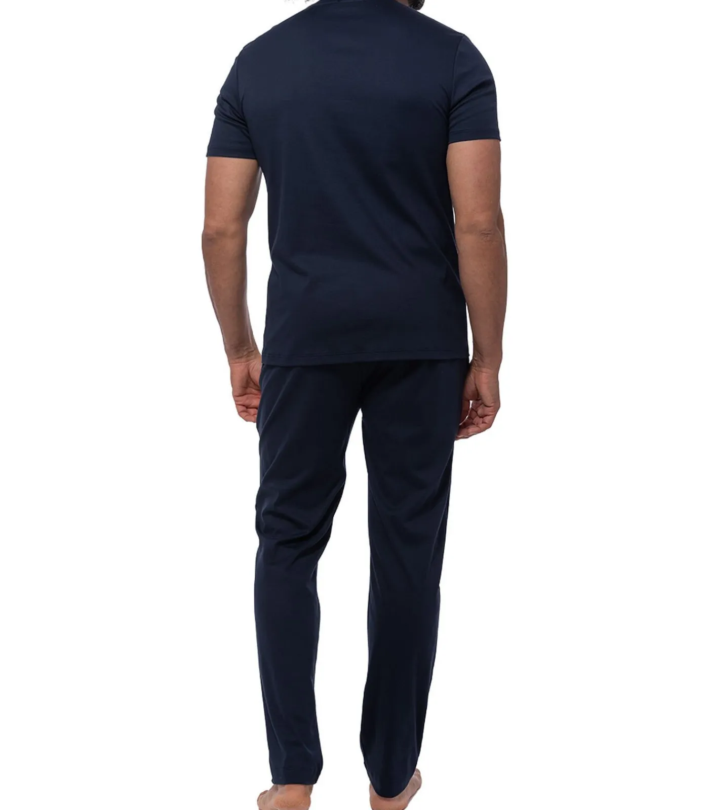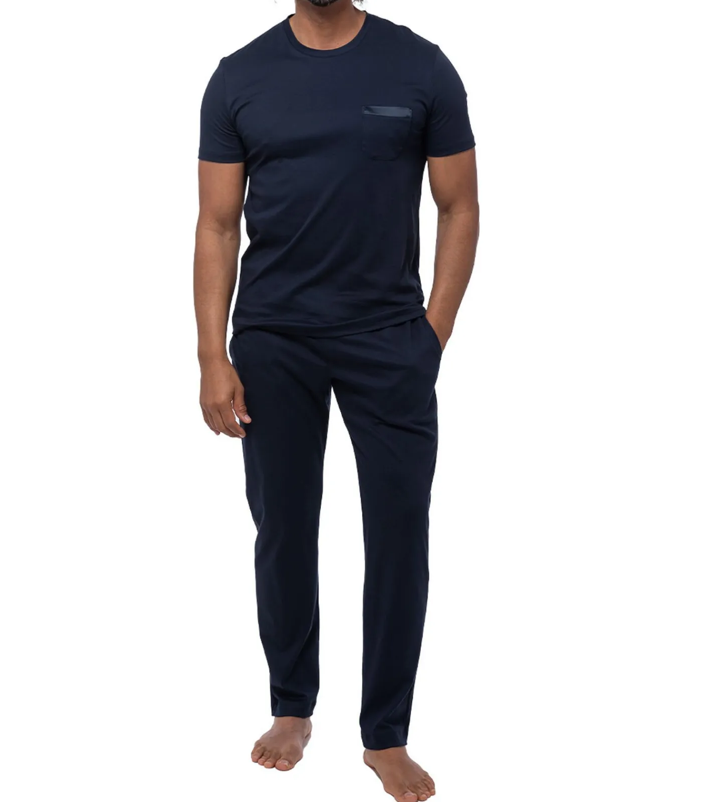 De herenpyjama uit de Aarhus–serie is perfect voor ontspannen nachten en combineert een comfortabel T–shirt met ronde hals en borstzak met een aangenaam zachte pyjamabroek van interlockkatoen. De elastische geweven tailleband, steekzakken en losse pasvorm zorgen voor allround comfort – ideaal om te ontspannen en te slapen.
