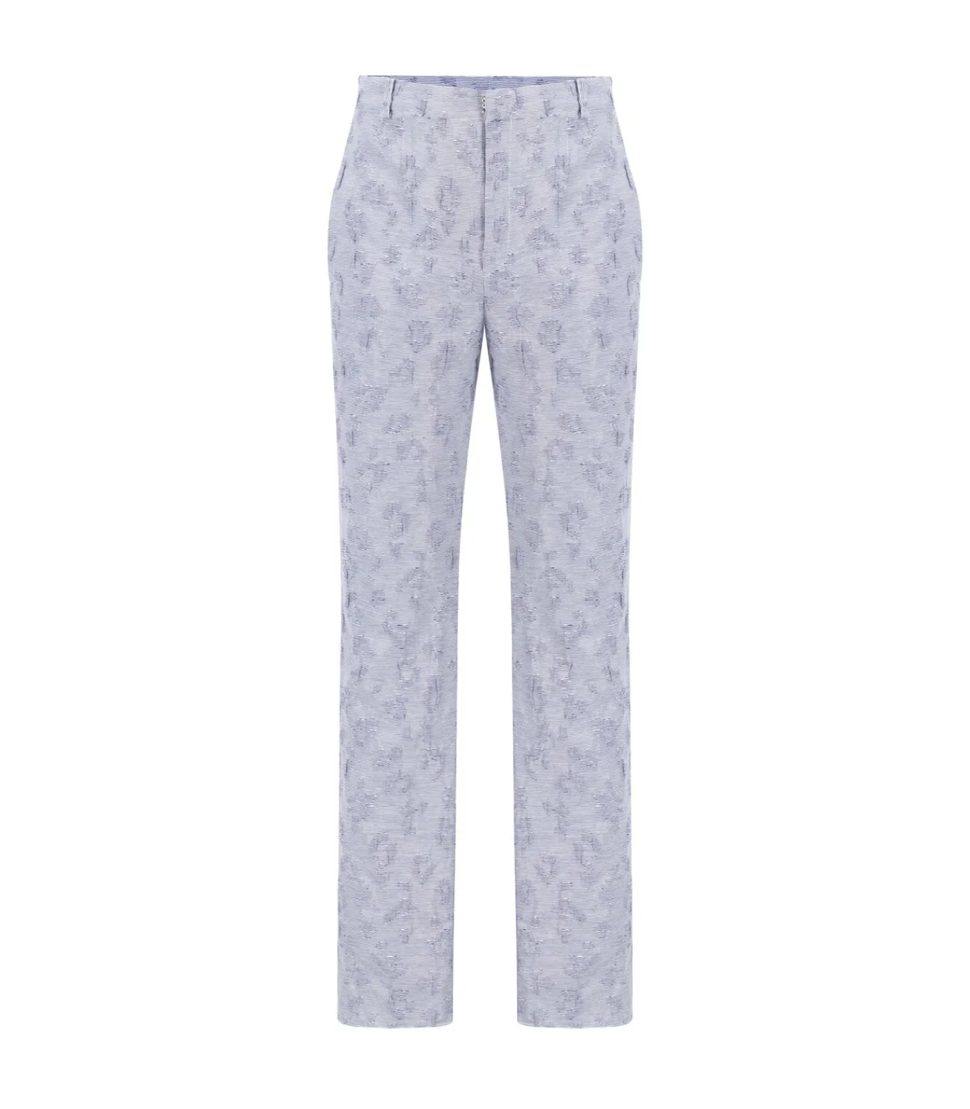 Blauwe jacquardbroek met hoge taille, rechte pijpen, riemlussen, verborgen sluiting en ritssluiting aan de voorkant.