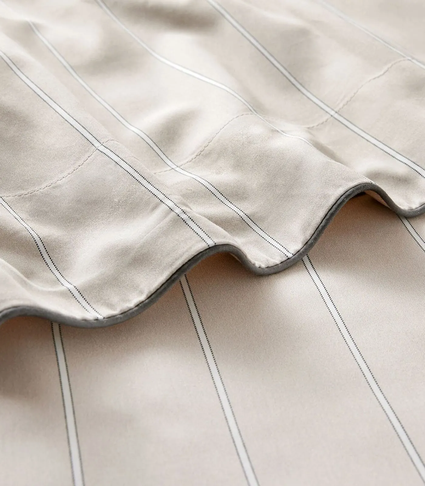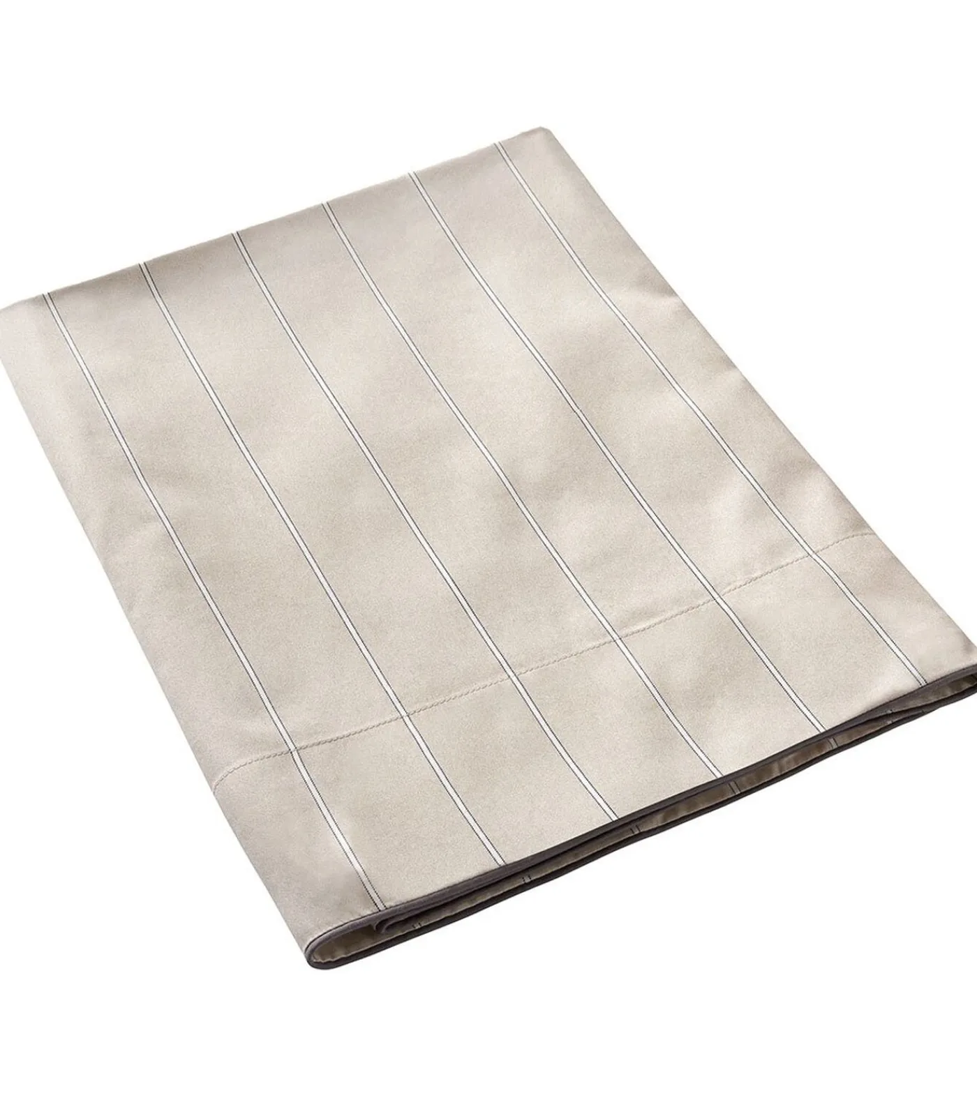 Bedrukking van brede verticale strepen op een grègekleurige achtergrond.Bies van 8 cm.Afgewerkt met een grijze paspel.