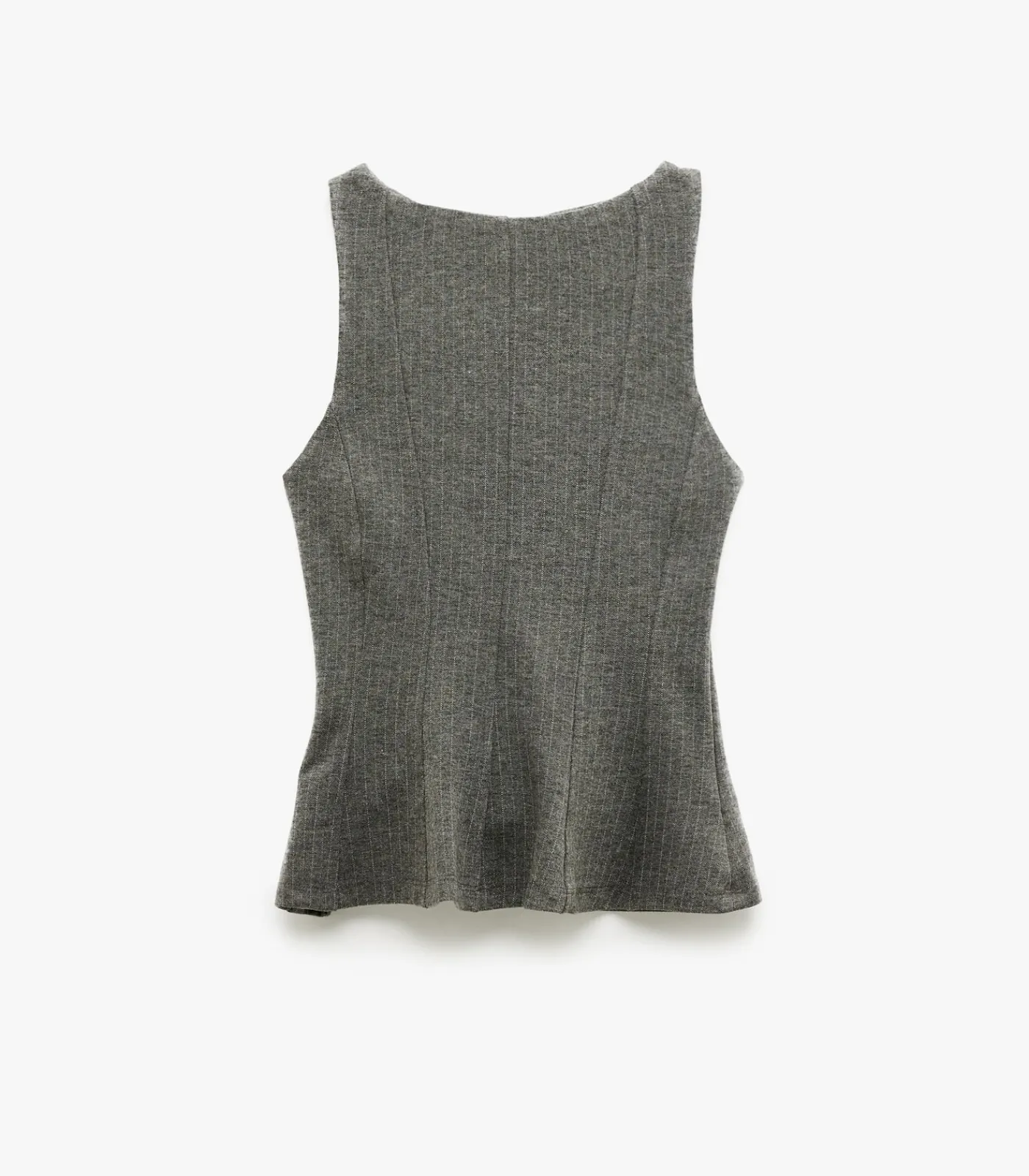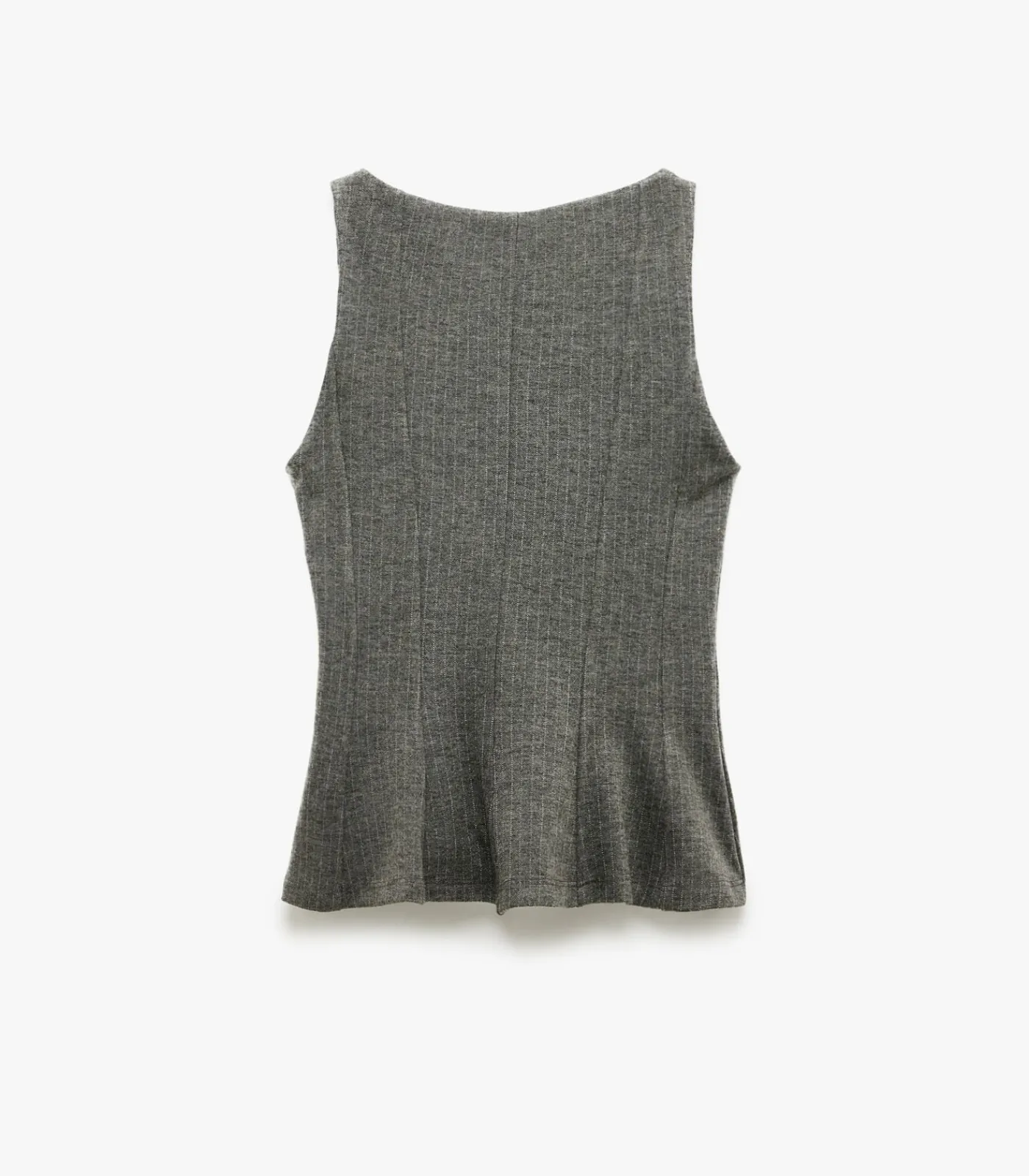 Deze stijlvolle en moderne grijze peplum top heeft een elegante ronde halslijn. Met een slanke pasvorm en fijne metallic details, is deze mouwloze top perfect voor zowel dagelijkse draagmomenten als speciale gelegenheden. De peplum snit geeft een flatterend silhouet, ideaal te combineren met spijkerbroeken of rokken voor een veelzijdige look.