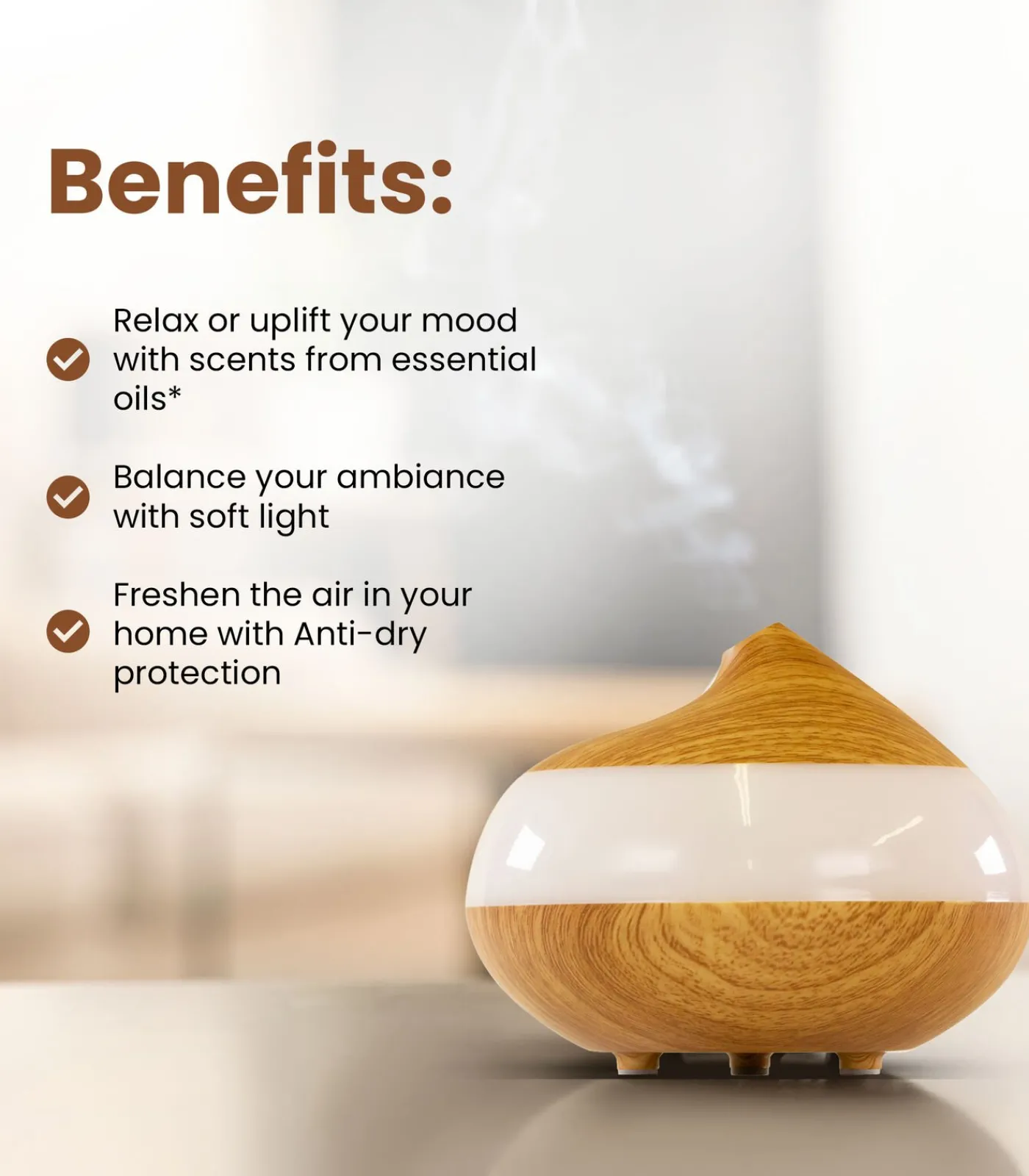 Dr Botanicals Bio–Balance Houten Aromadiffuser is een therapieapparaat met nieuwe technologie dat aromatherapie, lichttherapie en een luchtzuiveringssysteem combineert. Het beschikt over 7 wisselende lichtkleuren om verschillende sferen in de kamer te creëren, 2 nevelstanden die de geur reguleren van intens tot licht bij gebruik met essentiële oliën*, en biedt frisse luchtbevochtiging voor droge binnenlucht.Kenmerken:ü Werkt 1–3 uur met één vullingü 7 LED–lichtkleuren en 2 nevelstandenü Fluisterstilü Inhoud doos: 1 aromadiffuser, 1 adapter en 1 handleidingVoordelen:ü Ontspan of verbeter je stemming met geuren van essentiële oliën*ü Creëer een harmonieuze sfeer met zacht lichtü Verfris de lucht in huis met anti–droogtebescherming