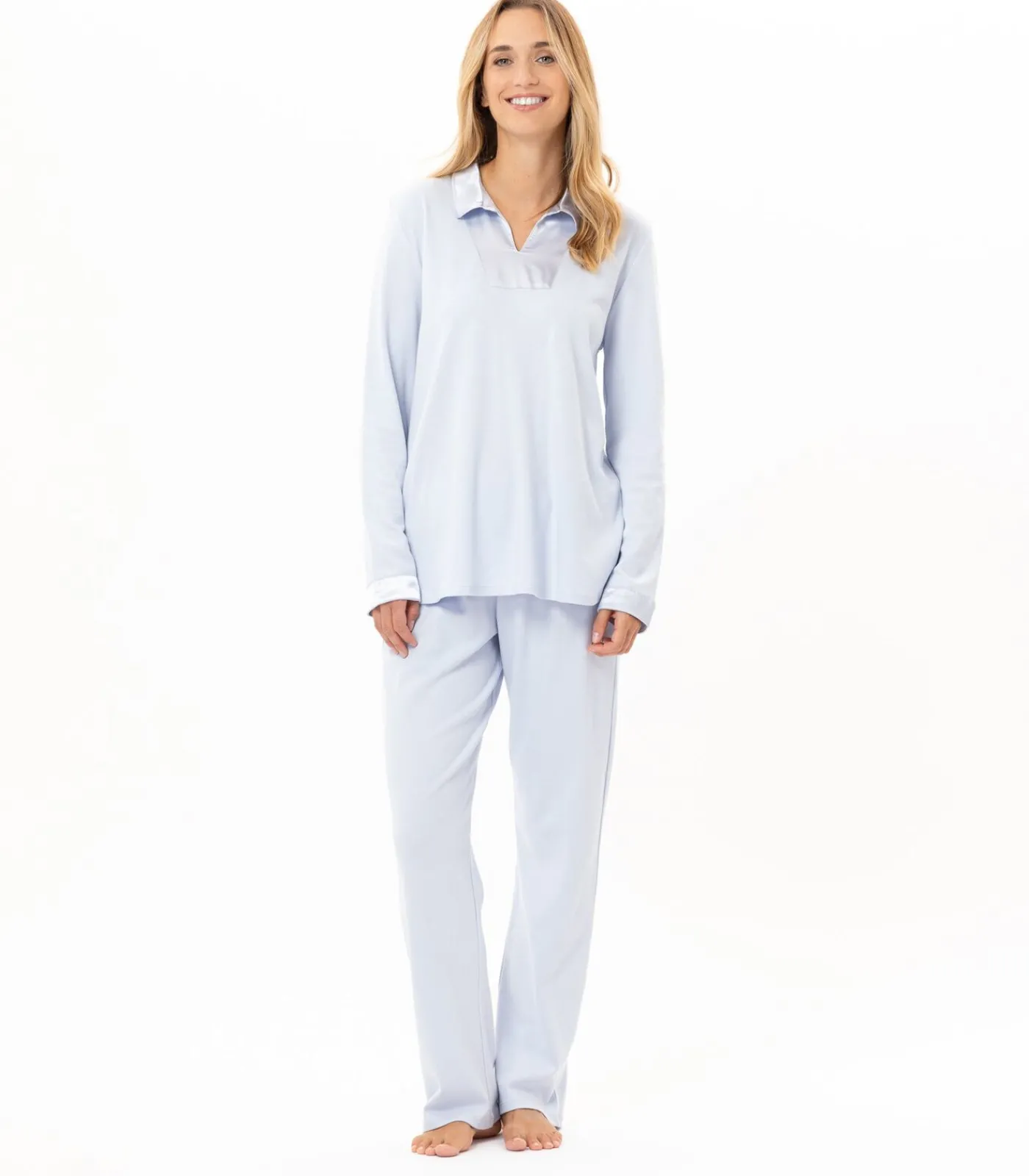 – De open V–hals in polostijl met borststuk, manchetten en tailleband van de broek zijn gemaakt van satijn, wat een mooie lichte toets geeft aan de Andy–pyjama.