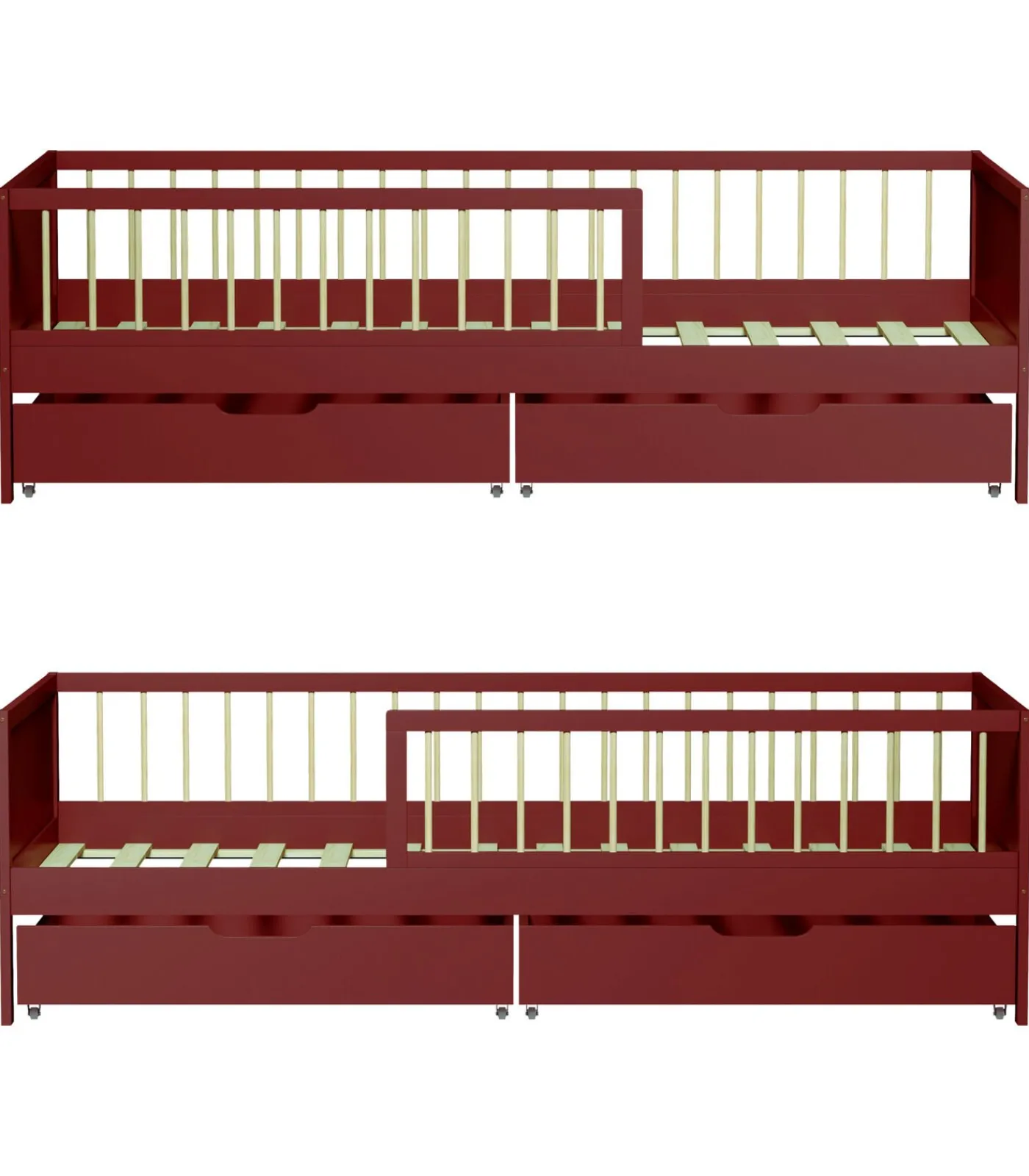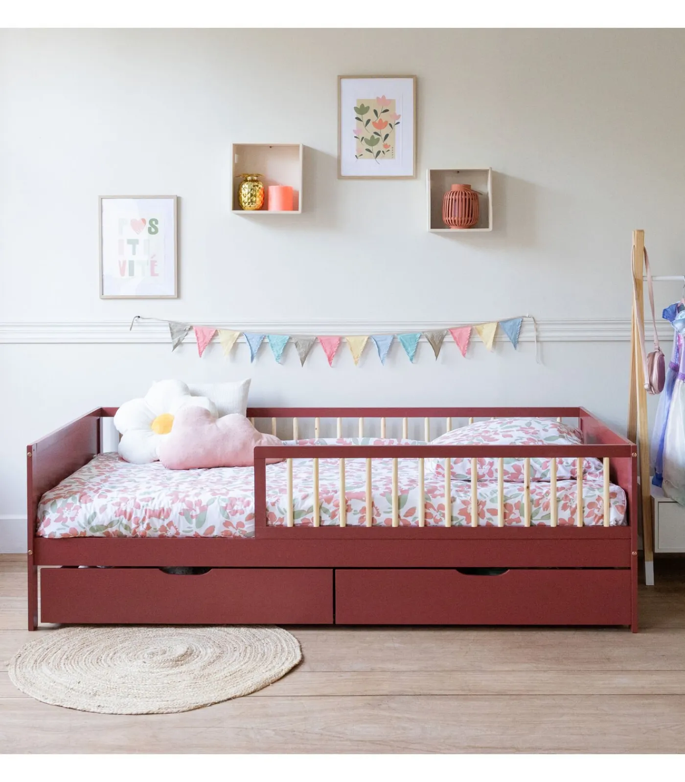 Dit bed valt op door zijn moderne, functionele ontwerp, ideaal om de slaapruimte van je kind te verbeteren. Het past gemakkelijk bij verschillende decoratiestijlen en voegt een levendig tintje toe. Een van de belangrijkste voordelen is het opbergsysteem. Uitgerust met lades op wieltjes biedt het praktische extra ruimte voor het organiseren van het speelgoed, de boeken of de kleren van je kind, waardoor het gemakkelijker wordt om de slaapkamer netjes te houden. Deze gemakkelijk te gebruiken lades helpen de ruimte te optimaliseren en maken het dagelijks leven georganiseerder en aangenamer!
