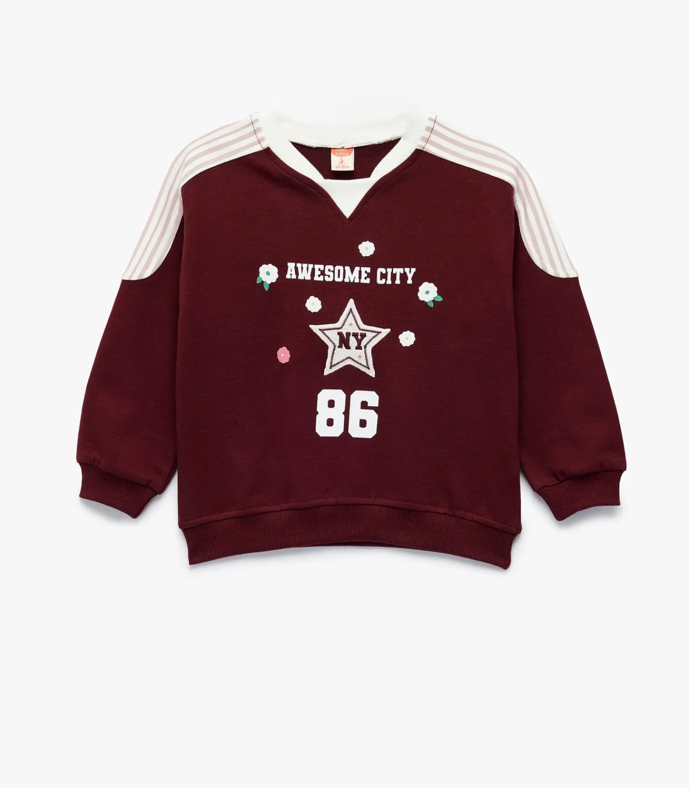 Koton Soft interior cotton long sleeve color contrast V–neck printed sweatshirt.