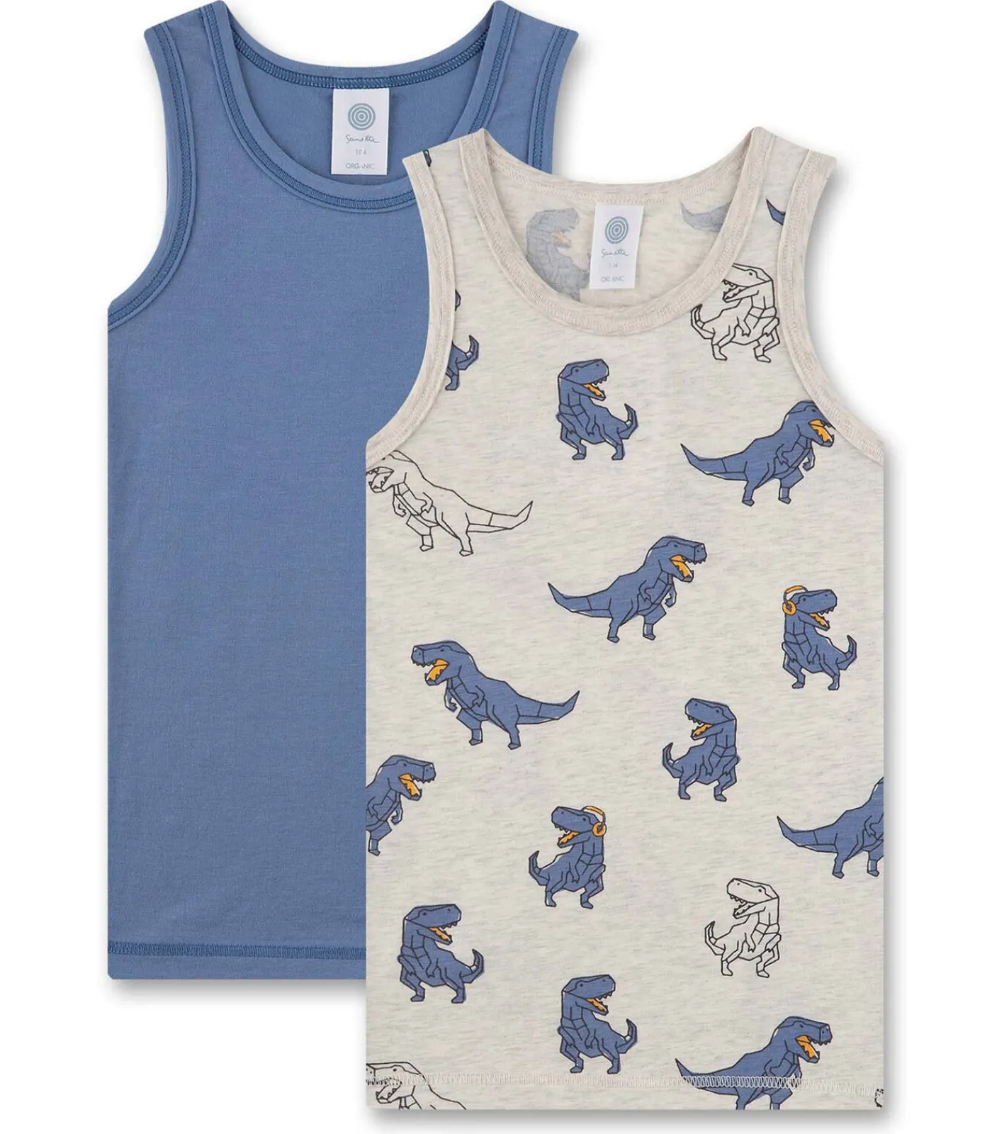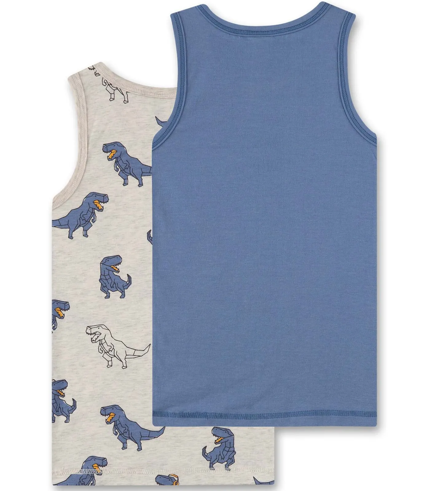 Twee tops voor jongens van het merk Sanetta. 1x effen en 1x met een all–over dinosaurusprint. Zachte jersey van rekbare katoenen stof.