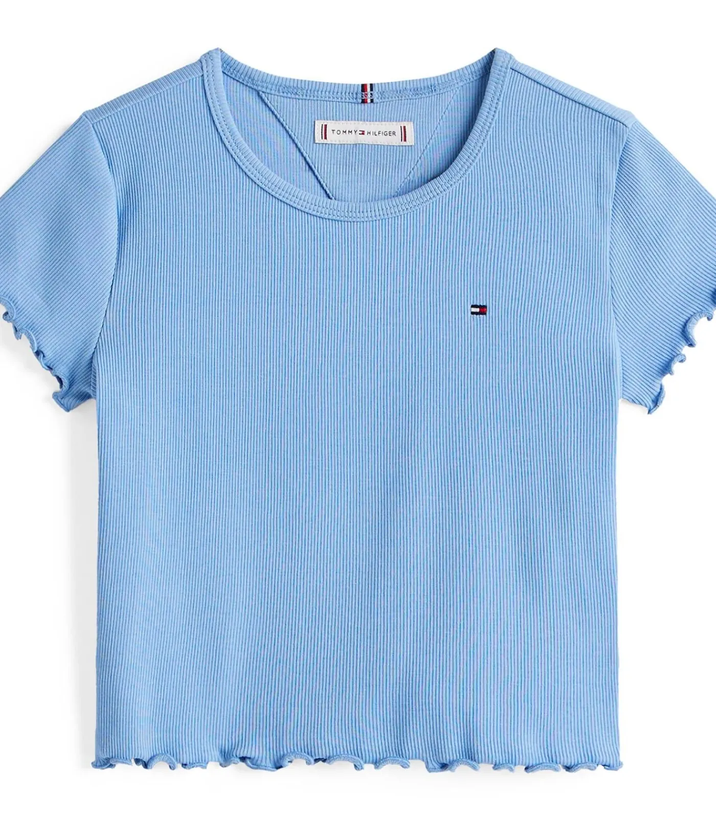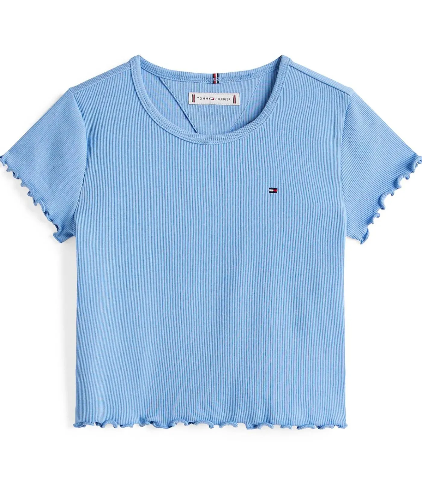 Kleur: Cloudy Blue Samenstelling: 95% katoen, 5% elastaan Mouwen: Kort Halslijn: Ronde hals Pasvorm: Extra strak Details: Geribbeld stretchkatoenen T–shirt met decoratieve ruches aan de manchetten en zoom. Afgewerkt met kenmerkende tape in de nek en een geborduurde Tommy Hilfiger–vlag op de borst. De perfecte mix van comfort en moderne vrouwelijkheid. Gebruik: Ideaal voor trendy outfits, perfect te combineren met jeans of rokken voor een verfijnde, casual stijl.