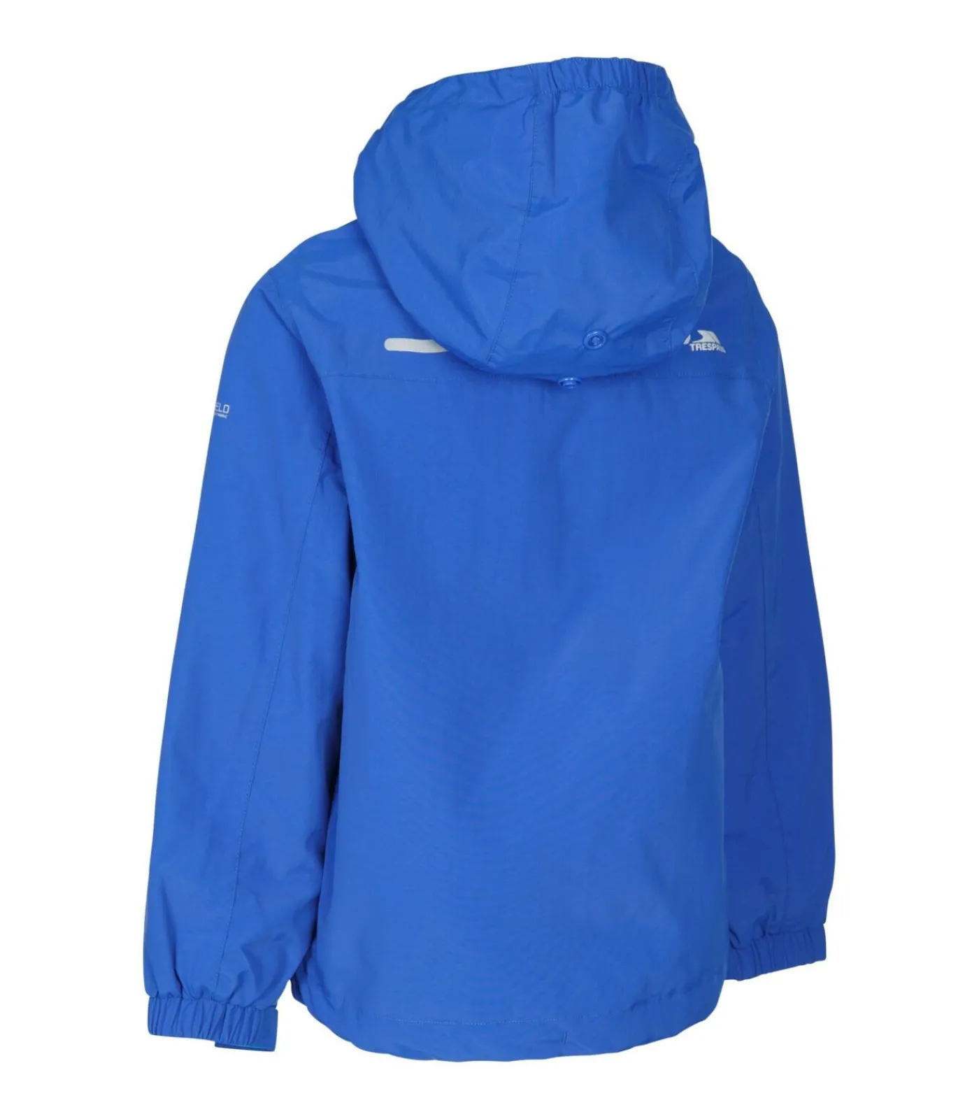Deze jas is gemaakt door het merk Trespass Boys. Het buitenmateriaal is 100% polyamide met een PU coating. De voering is 100% polyester. Het heeft een geweven stof constructie. Het ontwerp is effen met een logodetail. Het heeft een contrastkleurige rits met een stoffen ritstrekker. De jas is niet gewatteerd en heeft reflecterende details. De naden zijn getapet voor waterdichtheid. De gebruikte stoftechnologie is TP50, waardoor het jack zowel water– als winddicht is. De manchetten hebben een verstelbare sluiting. De hals heeft een afneembare capuchon met elastiek. Er zijn twee steekzakken en twee borstzakken. De hoofdsluiting is een waterbestendige rits over de hele lengte. De waterdichtheid van de jas is 3000mm.