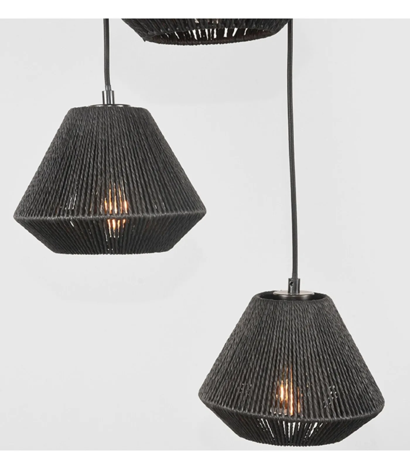 Hanglamp Ibiza 3–lichts bestaat uit drie diamantvormige kappen, voorzien van zwart geweven jute. Door de geweven draad ontstaat er een halfopen lijnenspel waardoor er een prachtig lichteffect met schaduwwerking ontstaat als de lichtbronnen branden. De diamantvormige kappen hangen op verschillende hoogtes, middels een zwartkleurig strijkijzerkoord vast aan de ronde zwarte metalen plafondplaat. De verspringing in hoogte zorgt voor extra dynamiek en een speelse touch.