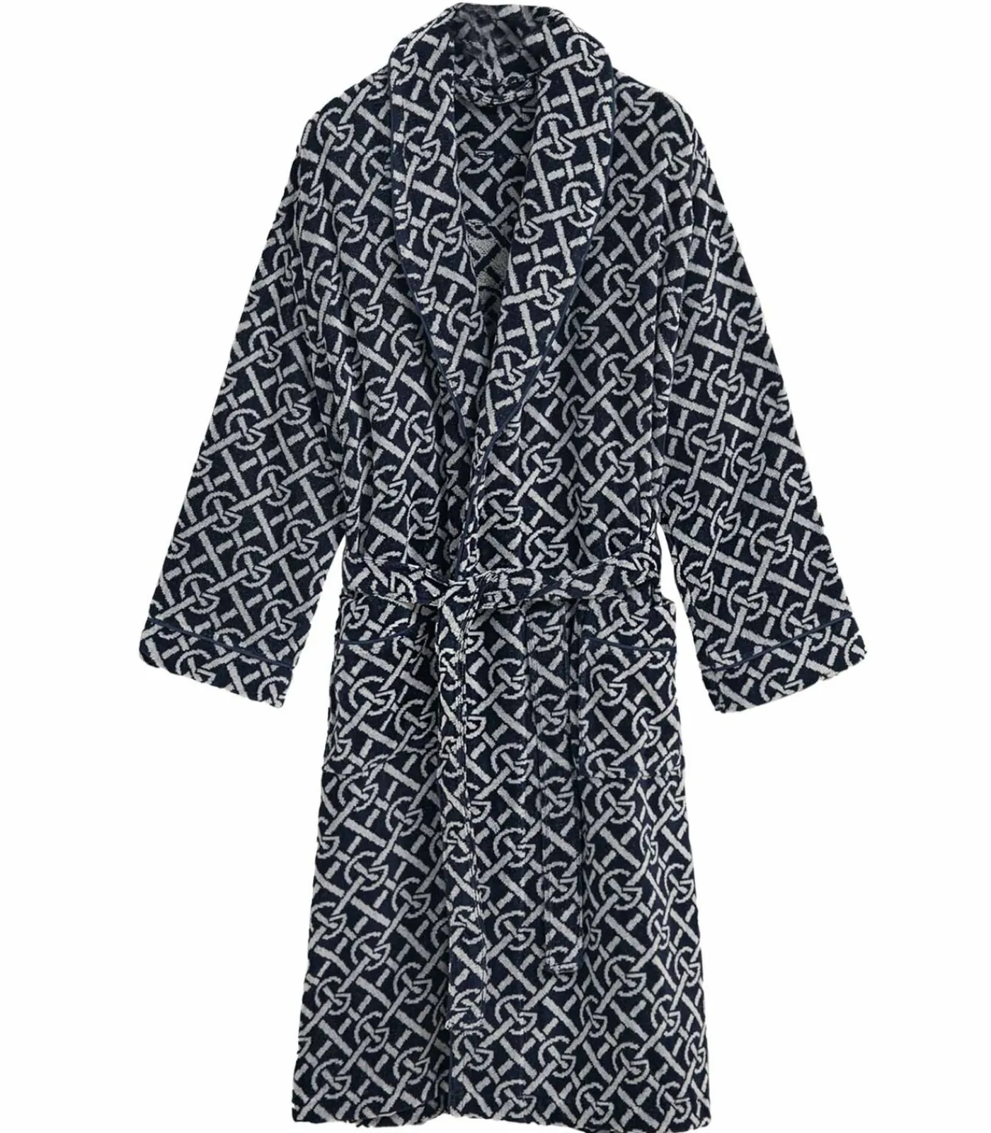 Gedessineerde badjas voor dames en heren van het merk GANT. Hoogwaardige badstof van velours gemaakt van puur biologisch katoen. Met sjaalkraag, ceintuur en opgestikte zakken.