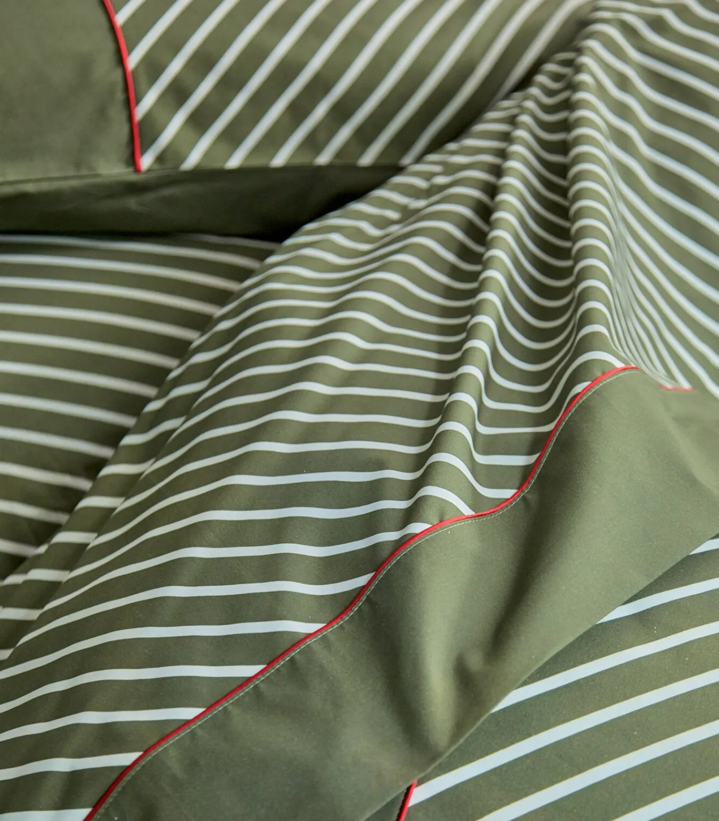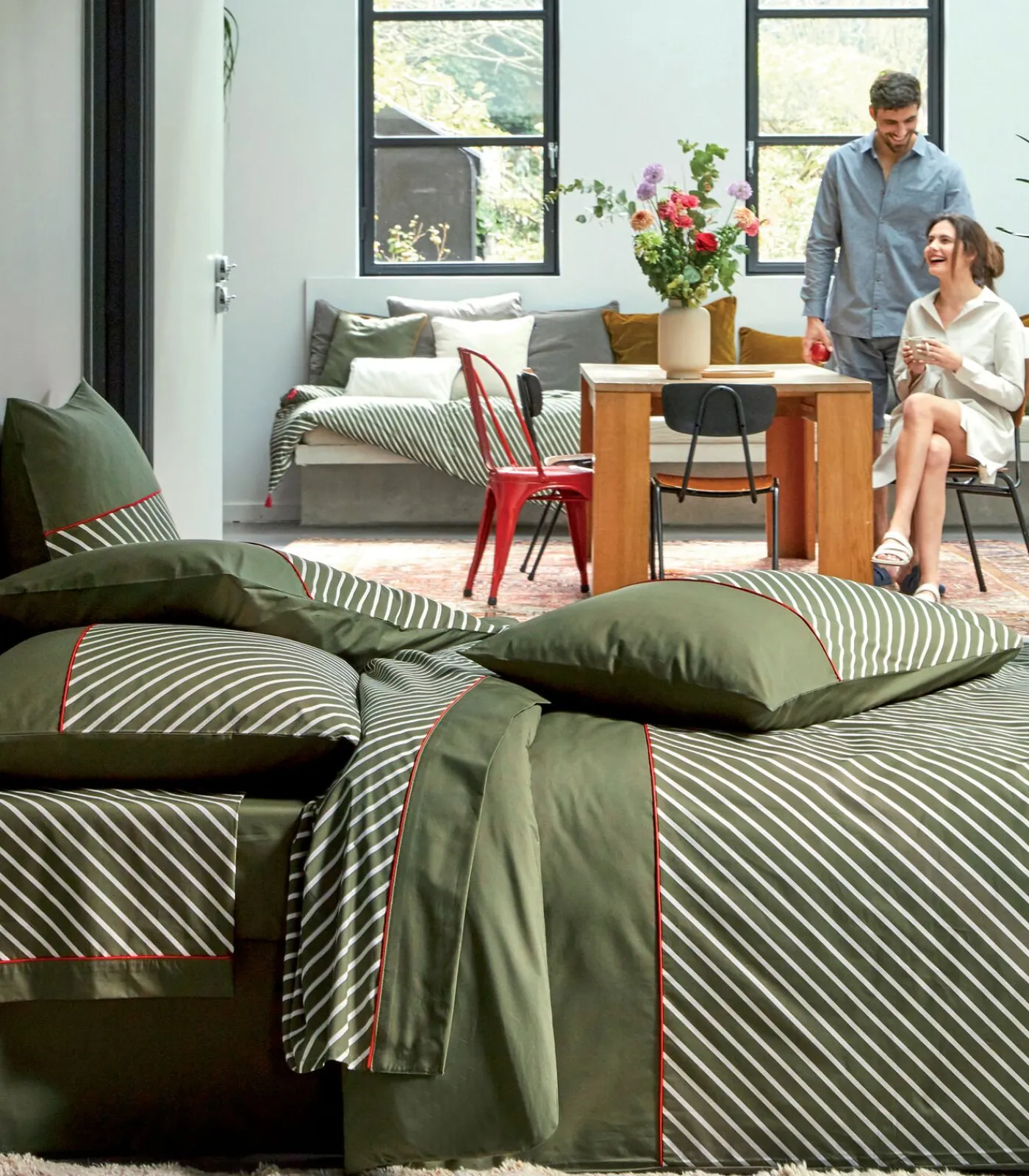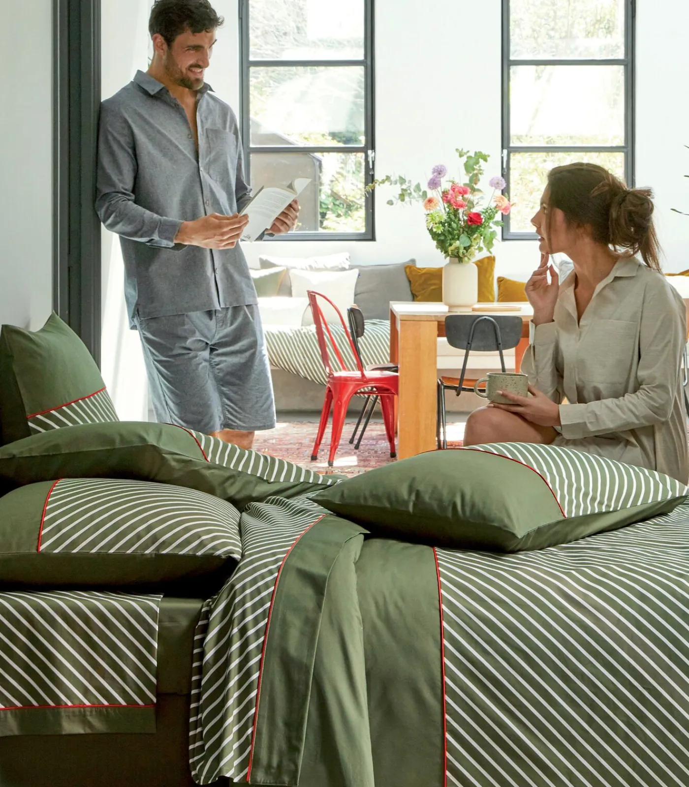 “Door samen te werken met het jeansmerk 1083, hebben we ervoor gekozen om de iconische keperstreep, zo kenmerkend voor Denim, te accentueren. We hebben het in twee kleuren afgewezen: Indigo en Mousse en geaccentueerd met een biezenafwerking. rood, de emblematische kleur van deze jonge merk.Deze items worden geweven, geverfd, bedrukt en gemaakt in de Vogezen.”