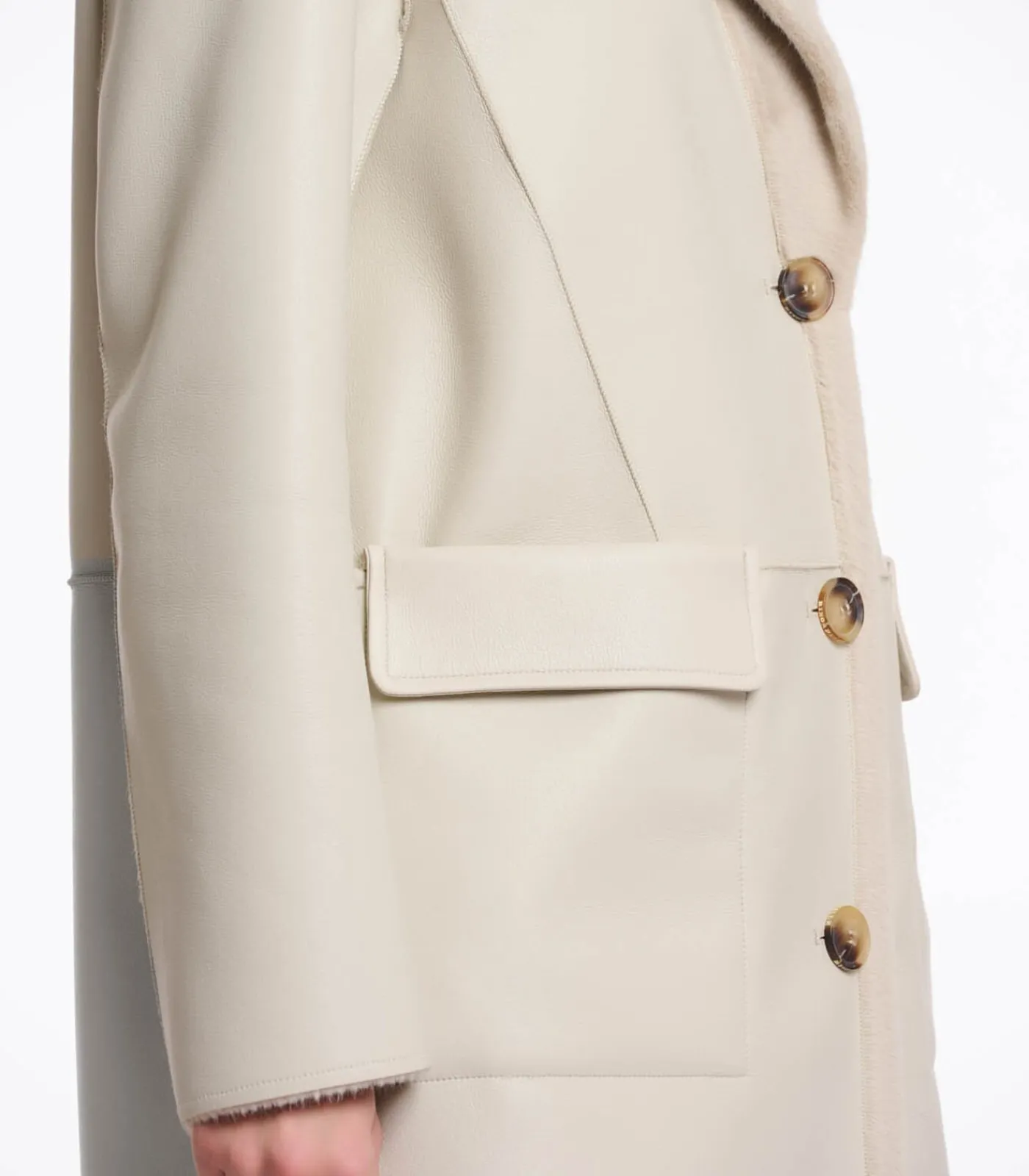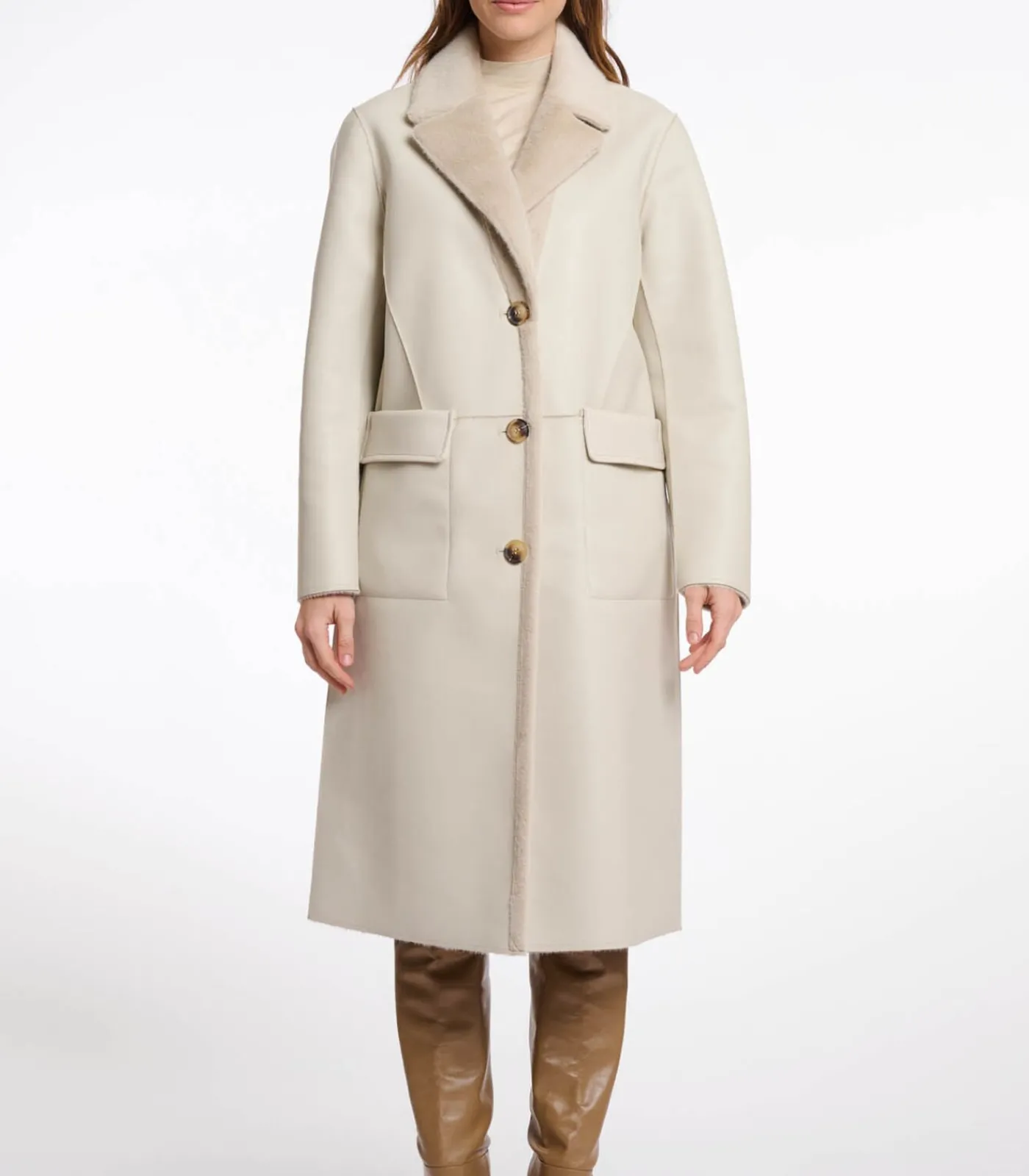 Omkeerbare damesjas met een vrouwelijke look. Deze halflange jas kan op twee manieren gedragen worden. De jas heeft een knoopsluiting en een reverskraag. Aan de ene kant is de jas gemaakt van imitatieleer en heeft hij twee steekzakken met klep. De andere kant is gemaakt van luxe imitatiebont en heeft twee voorzakken met ritssluiting.