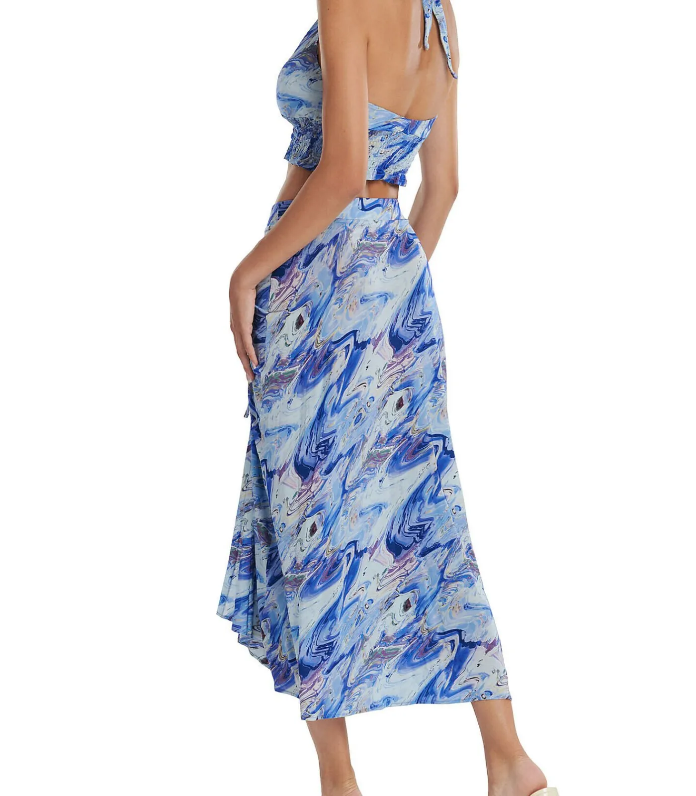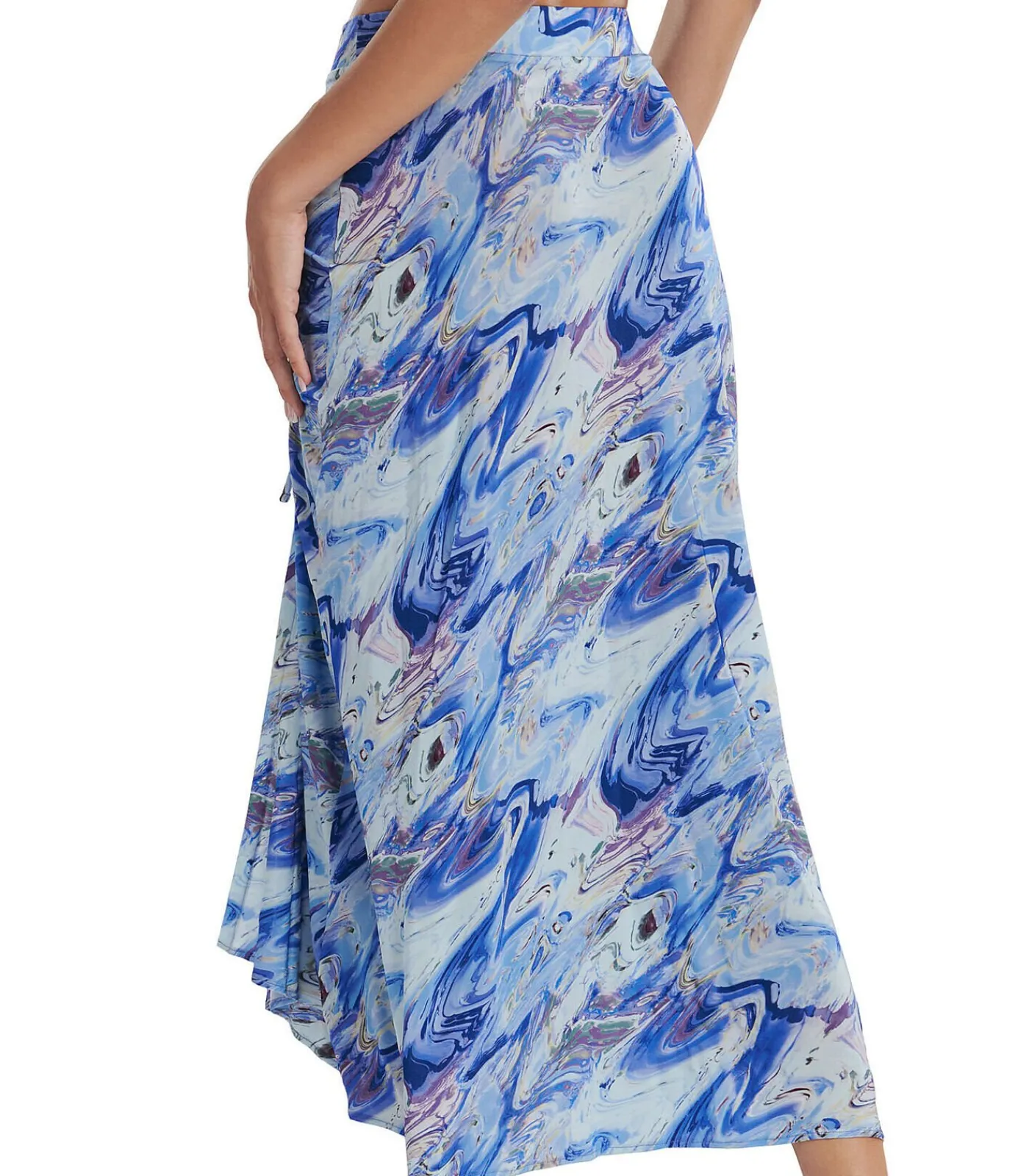 Een must–have zwemkledingaccessoire in een uiterst moderne, natuurlijke en dus tijdloze gemarmerde print voor gedurfde en modieuze vrouwen. Elegante en geraffineerde details van draperieën, plooien of vouwen. Het kan worden gedragen als zomerkleding of gecombineerd met uw bikini op het strand. Vloeiend breisel van viscose leent zich goed voor draperen. De natuurlijke kleuren van marmer en halfedelstenen en hun schakeringen vormen een delicaat, bleek patroon. Het eerste kleurenpalet wordt gekenmerkt door jade–olijf tinten gemengd met warme neutrale aardetinten. Het tweede palet bevat verschillende blauwtinten met koele neutrale zandtinten.[Rok alleen verkocht. Top, schoenen en andere accessoires gedragen door het model op de foto’s zijn niet inbegrepen]Materialen:6% elasthaan, 94% viscose
