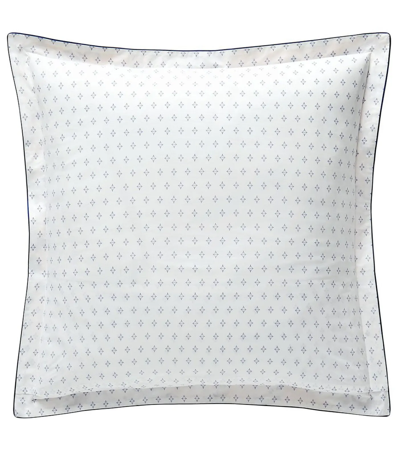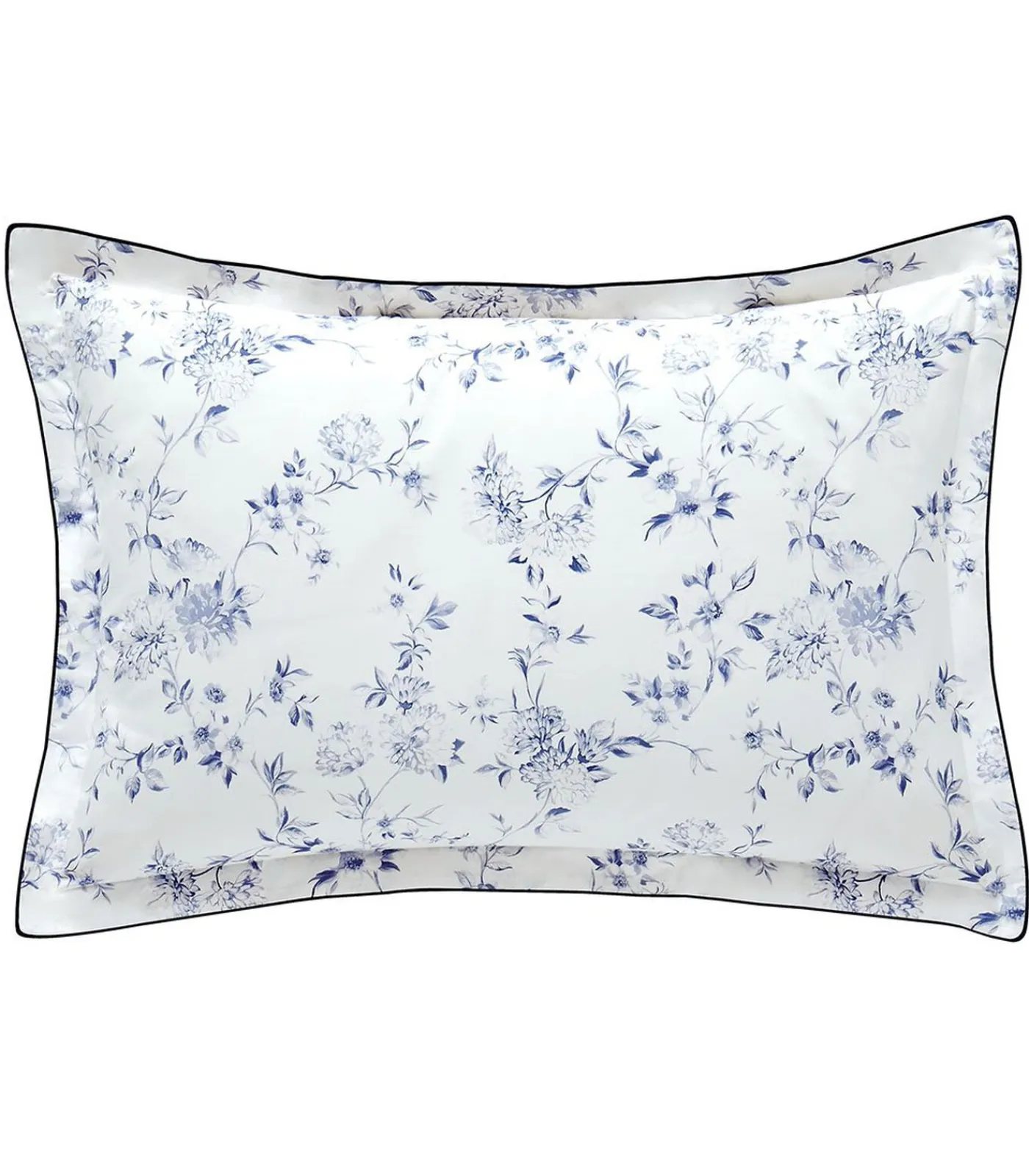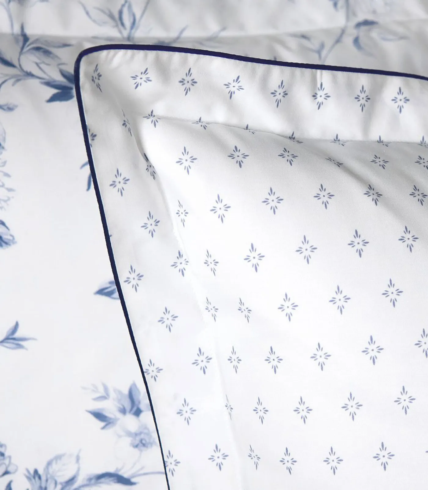 Blauwe bloemenprint op optisch witte achtergrondAchterkant met blauwe faïenceprint op optisch witte achtergrondSloop met platte volant van 3,5 cmAfwerking met marine biezen