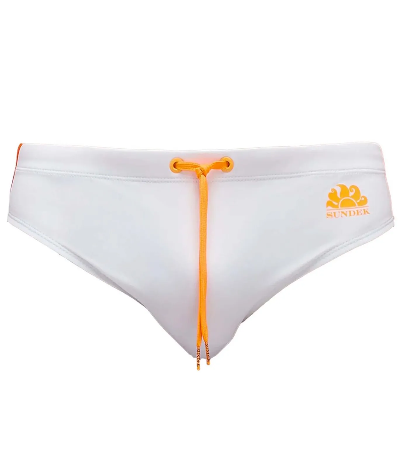 Kleur: Off White Samenstelling: 78% polyamide, 22% elastaan Pasvorm: Slim Fit Sluiting: Trekkoord in de taille Binnenkant: Gevoerd Details: Monochrome zwembroek met contrasterende driekleurige zijstrepen, Sundek–logo op de voorkant en rubberen patch op de achterkant. Rekbare, duurzame en sneldrogende stof. Gebruik: Ideaal om te zwemmen, watertrainingen te doen of gewoon te ontspannen in de zon.