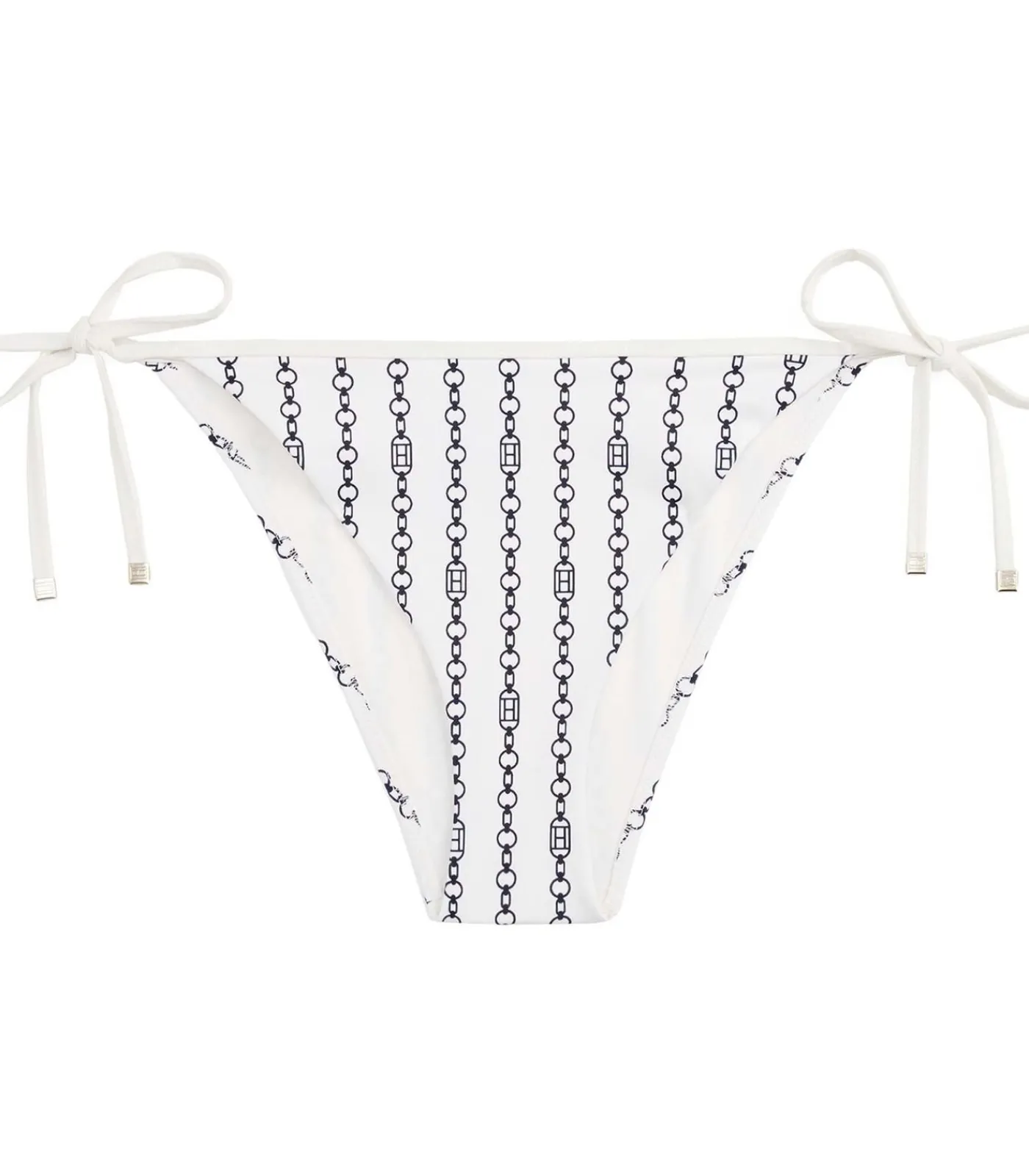 Kleur: Flag Chain Ivory Silk Samenstelling: 80% nylon, 20% elastaan Details: V–hals bikinibroekje van technisch stretchmateriaal met all–over print, afgewerkt met strikbandjes aan de zijkanten en een TH–monogramplaatje op de rug. Een perfecte mix van vrouwelijkheid en grafische stijl van Tommy Hilfiger Duurzaamheid: Gemaakt van gecertificeerd gerecycled nylon, verkregen uit de recycling van gebruikte stoffen, tapijten en visnetten voor een lagere milieu–impact Gebruik: Ideaal voor het creëren van gepersonaliseerde en verfijnde strandlooks, met een vleugje mode in elk detail