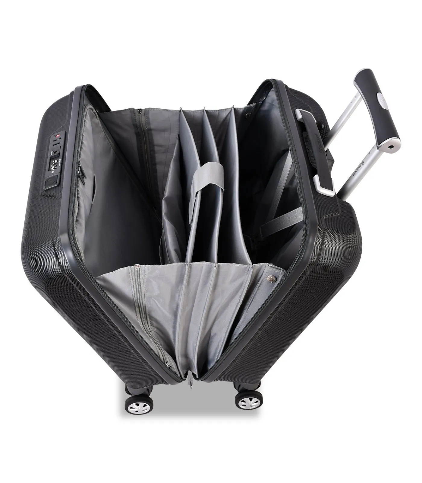 De Kapstadt Pilotenkoffer combineert stijl, functionaliteit en veiligheid om aan al uw zakelijke reisbehoeften te voldoen. Met een compact en slim ontwerp biedt deze case de ideale oplossing om uw essentiële spullen georganiseerd en binnen handbereik te houden. Gemaakt van 100% Makrolon® polycarbonaat, is de koffer duurzaam, lichtgewicht en bestand tegen intensief gebruik.Met afmetingen van 46x42x23 cm en een gewicht van slechts 3,2 kg, biedt de pilot case een royale inhoud van 37 liter, perfect voor zakenreizen of dagelijkse pendelritten. Het interieur is voorzien van een gevoerd vak voor laptops of tablets tot 15 inch, evenals drie extra compartimenten voor documenten en andere benodigdheden. Dit zorgt ervoor dat uw spullen altijd georganiseerd en gemakkelijk toegankelijk zijn.De Kapstadt Pilot Case is ontworpen voor moderne reizigers en is uitgerust met een externe USB–A en USB–C oplaadpoort. Sluit eenvoudig uw powerbank (niet inbegrepen) aan binnenin de koffer en laad uw apparaten onderweg op. Dit innovatieve ontwerp biedt gemak en efficiëntie voor professionals die altijd verbonden moeten blijven.De Add–a–Bag sleeve op de achterkant maakt het eenvoudig om de pilot case aan uw koffer te bevestigen. Hierdoor reist u handsfree en navigeert u soepel door luchthavens en treinstations.Voor extra veiligheid beschikt de Kapstadt Pilot Case over een ingebouwd TSA–goedgekeurd combinatieslot, waarmee uw spullen veilig zijn tijdens internationale reizen. Dit biedt gemoedsrust, wetende dat uw eigendommen beschermd zijn tegen ongeautoriseerde toegang.De vier 360° dubbele spinnerwielen zorgen voor een stille, soepele en stabiele rit, ongeacht de ondergrond. Of u nu door drukke terminals navigeert of over hobbelige straten rolt, de Kapstadt Pilot Case beweegt moeiteloos mee, waardoor u comfortabel en stressvrij reist.Met zijn strakke ontwerp, innovatieve functies en uitzonderlijke organisatie is de Kapstadt Pilot Case de ultieme reisgenoot voor professionals. Of u nu op zakenreis bent of gewoon uw dagelijkse benodigdheden meeneemt, deze koffer combineert elegantie en functionaliteit in een compacte en betrouwbare vorm. Kies voor de Kapstadt Pilot Case en reis efficiënt, georganiseerd en in stijl.
