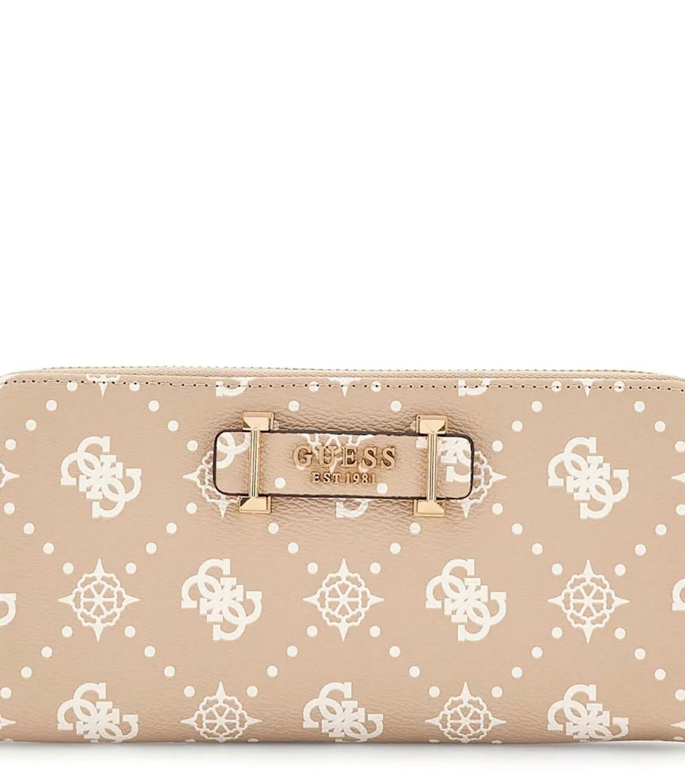 Kleur: Biscuits–logo Samenstelling: 100% polyurethaan Sluiting: rits Binnenkant: meerdere compartimenten en ritsvak voor munten Details: logo aan de voorkant in goudkleurig metaal en monogramprint over het hele oppervlak Gebruik: ideaal om een vleugje glamour toe te voegen aan het dagelijks leven, perfect voor het stijlvol opbergen van pasjes, munten en contant geld