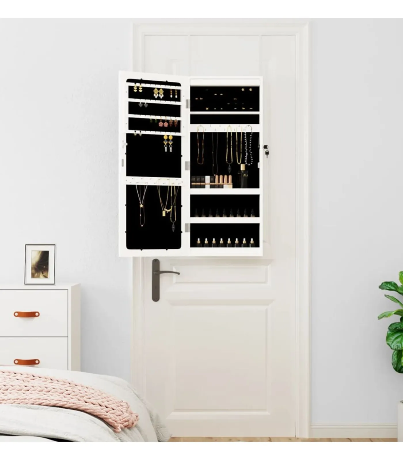 Handige LED–verlichting: de LED–verlichting bevindt zich bovenaan aan de binnenkant en gaat automatisch aan wanneer de deur opengaat, zodat je je sieraden kunt vinden.