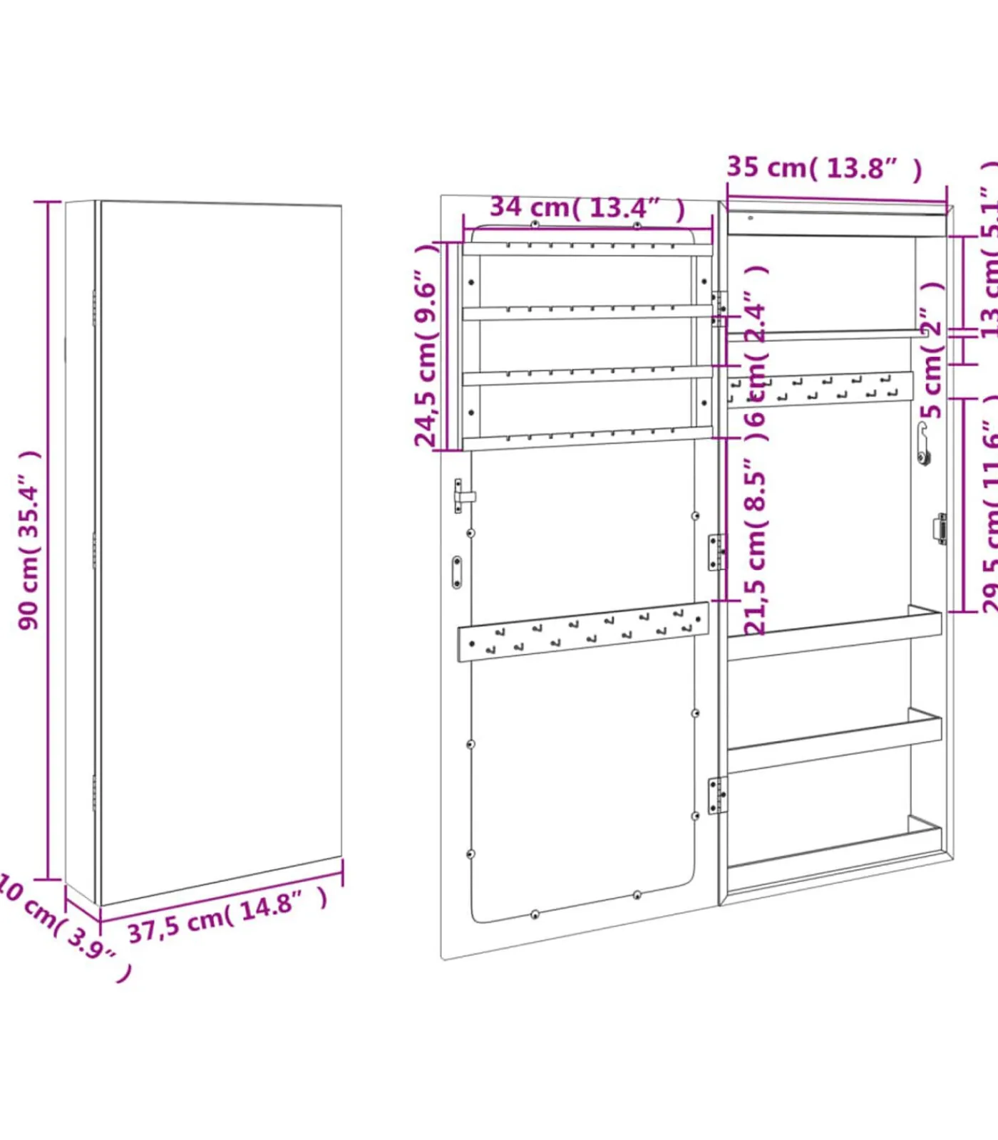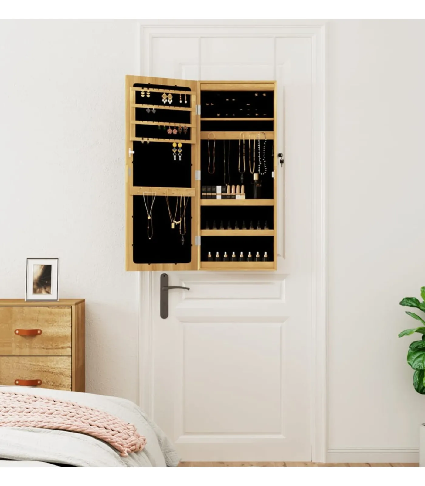 Voldoende opbergruimte: de spiegel met opbergruimte heeft veel haakjes, hangers en plankjes om je sieraden netjes geordend en binnen handbereik te houden.